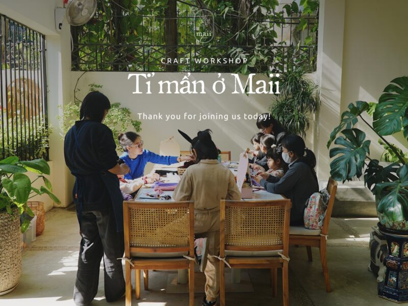 Vui ở Maii Workshop 2 Tháng 12, 2023 Vườn ở Maii Workshop trang trí thông tươi Xem Thêm Vườn ở Maii Triển lãm 31 Tháng 3, 2024 Her Story: Women in Art Her Story: Women in Art Xem Thêm Her Story: Women in Art Workshop 20 Tháng mười một, 2023 Tỉ mẩn ở Maii Workshop hộp hoa cảm ơn 20/11 Xem Thêm Tỉ mẩn ở Maii Workshop 14 Tháng 10, 2023 Vườn ở Maii Workshop làm hộp gương hoa Xem Thêm Vườn ở Maii Workshop 18 Tháng 9, 2023 Trung thu ở Maii Workshop Vẽ mặt nạ giấy & Phá cỗ trung thu Xem Thêm Trung thu ở Maii